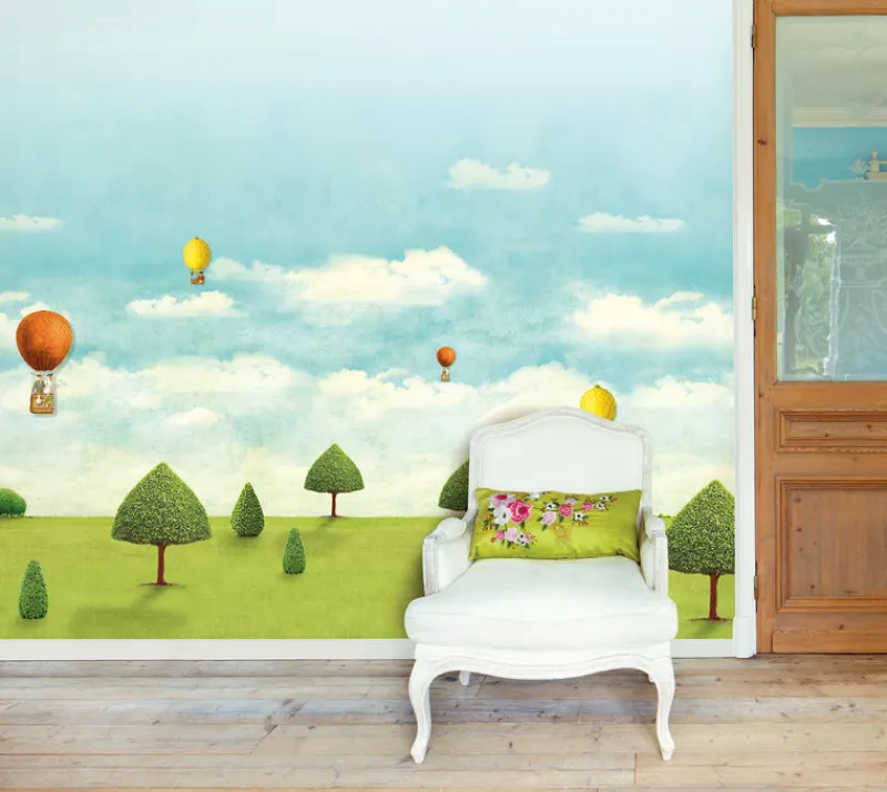 A dazzling nature scene that’s a mix of vintage and modern. Hot air balloons float over a grassy green meadow for a magical addition to any space. Comes in eight panels that assemble into a 9′ 2″ x 12′ 2″ mural.