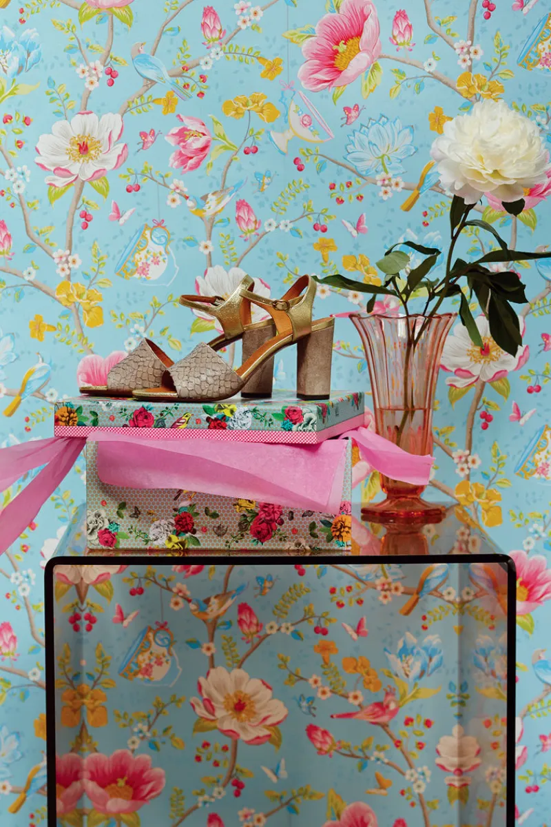 Birds perched between a dreamy garden of florals and teacups has a fresh vintage vibe! Create a space that’s full of color and wonder with this fabulous wallpaper by Eijffinger.