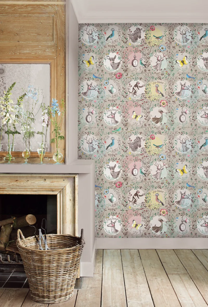 Framed portraits of deer and birds to zebras and butterflies, create an enchanting atmosphere. This elaborate wall mural redesigns your space in a happy and joyous collage. Comes in two panels that assemble into a 9′ 2″ x 3′ 1″ mural.