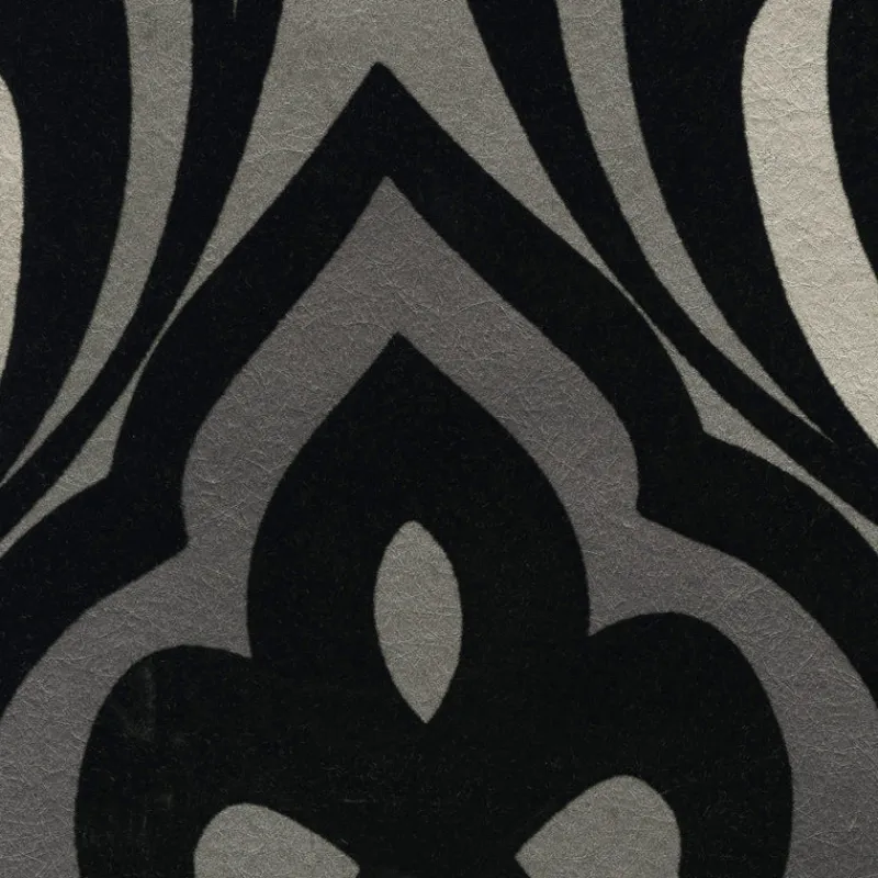 This seductive, swirling damask wallpaper is accomplished with various layers of lavish velvet over a burnished texture effect. The large scale design has elegant curves and a modern, silhouette style simplicity. Pewter silver, luxe black flock and polished taupe grey.