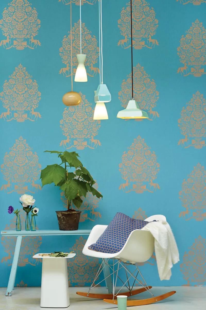 A glittering scene of copper floral bouquets erected inside a set of vases gives walls a elegant aura. Accompanied by a pair of prancing horses, this exquisite wallcovering by Eijffinger is a magical sight.