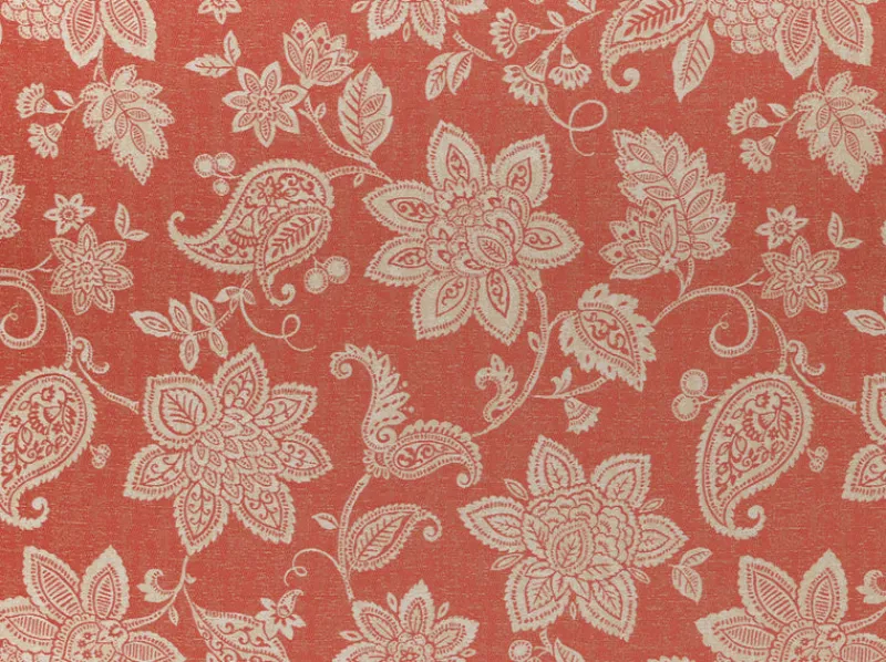 Dominica Rose Red is a pretty coral pinkish red floral printed outdoor upholstery fabric from Covington.