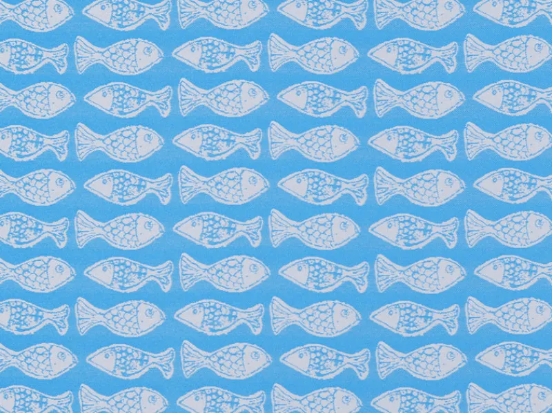 School Of Fish Caribe is a pretty turquoise blue fish print outdoor fabric from Covington.