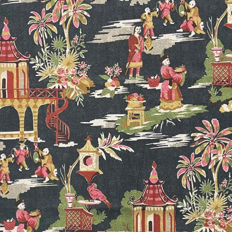 Discover luxury and sophistication with the Ganden Night Hamilton Fabric. Inspired by pagodas and Asian toile, this premium fabric will elevate any room with its elegant design. Bring a touch of art and culture to your home with this exclusive fabric.
