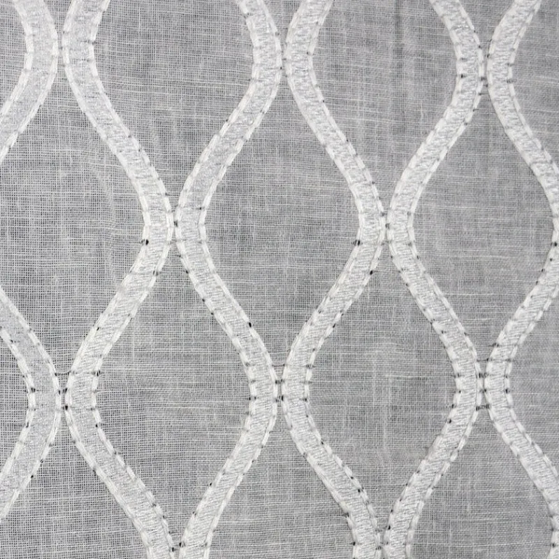 White trellis sheer fabric. Brookside Cloud is a Kaufmann designed sheer with an embroidered trellis design. This cloud white embroidered sheer fabric is perfect for light and airy drapery panels either lined or unlined. Beautiful table skirt in an entry foyer, a dust ruffle for your bed or window valances. Beautiful designer look without a high price. Very quality linen white embroidered material.