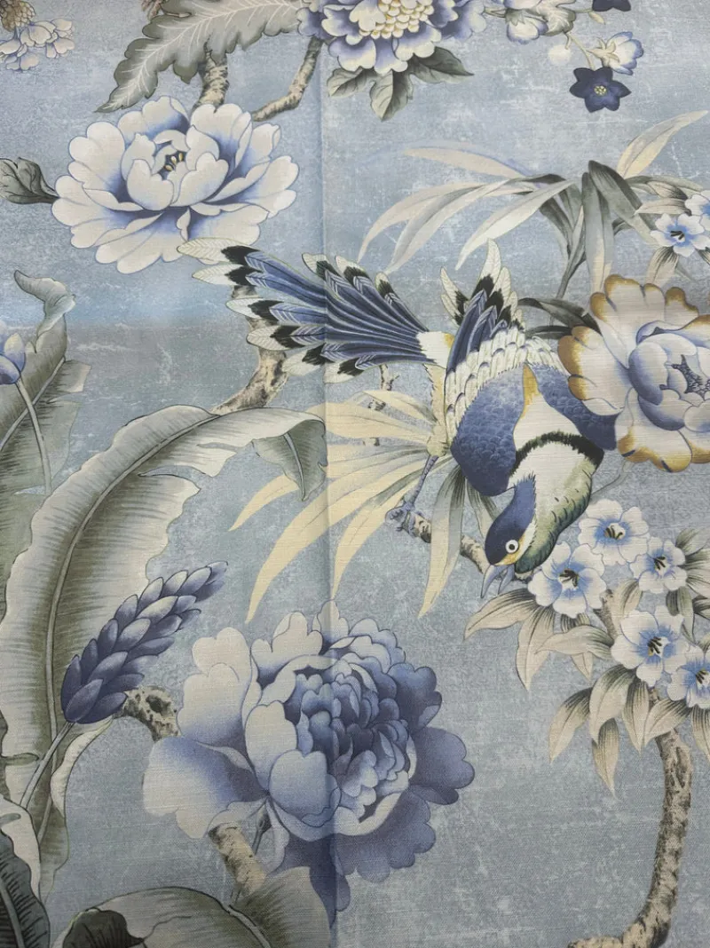 Introducing the Passerine Pavillion Blue Geyser P/K Lifestyles Fabric. This unique fabric features a large floral print with a tropical twist, adding a playful and vibrant touch to any project. Perfect for adding a pop of color to your home decor or fashion creations.