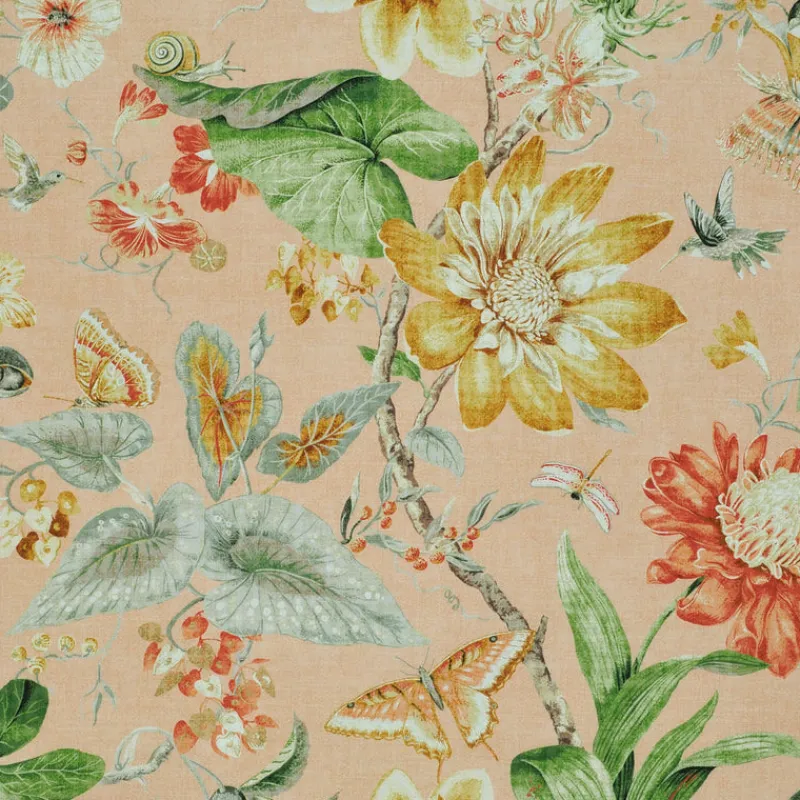 Tropical Pavilion Blush by P/Kaufmann featuring a bold tropical floral print with whimsical creatures like butterflies, snails, and hummingbirds, this cotton fabric adds a touch of daring to any project