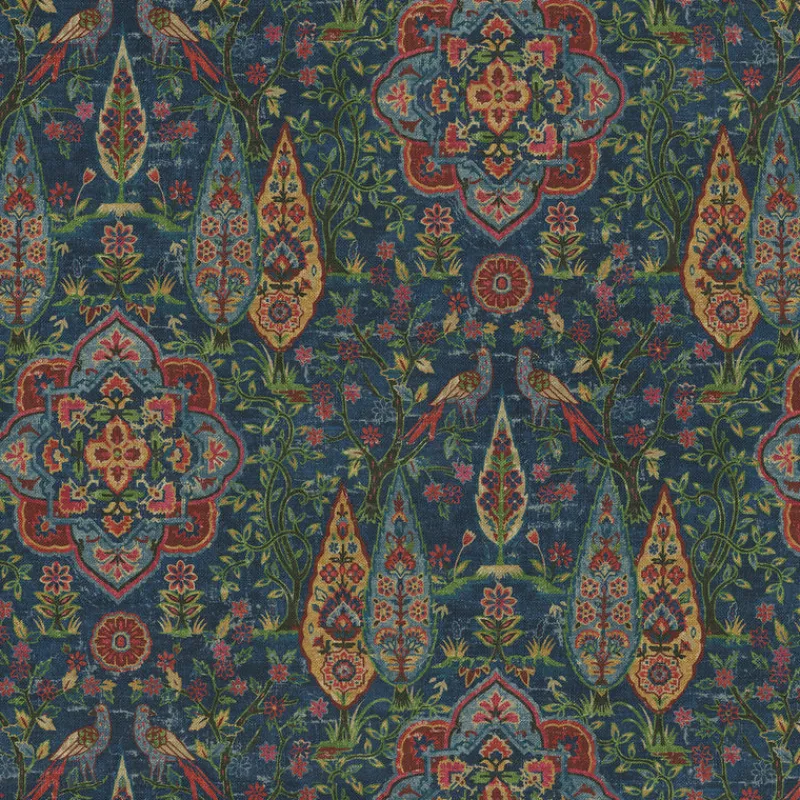 Elevate your space with the timeless elegance of our Wanderer Celestial Upholstery Fabric. This exquisite fabric boasts a luxurious tapestry of intricate floral and paisley motifs, skillfully woven into a backdrop of deep celestial blue. The design captures the essence of classic beauty, enriched with vibrant hues of red, gold, green, and teal that bring an opulent charm to any setting.