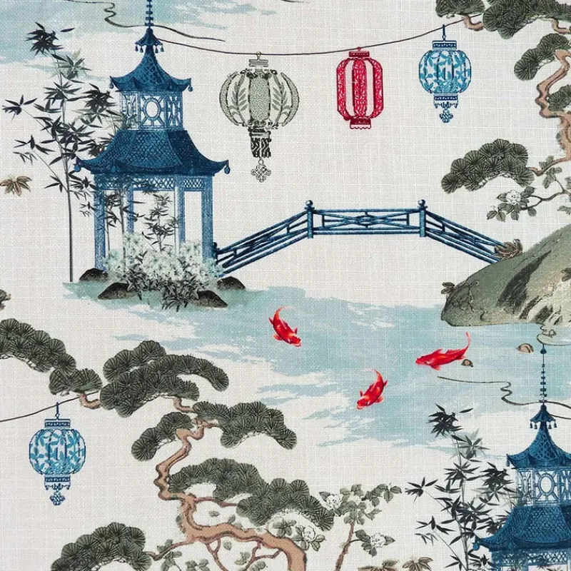 Colorful koi fish are found splashing in the water under a footbridge and paper lanterns lend pops of color creating the whimsical touches in Kirin Pearl while peaceful pagodas and yew plum pine trees create the focal point of this Japanese Garden inspired fabric. By Regal Fabrics, this fabric can be used for a plethora of design projects from drapery treatments to pillows to upholstery.