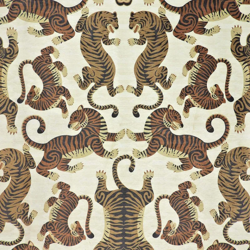 Get wild with our Tabby Cumin Regal Fabric, featuring a fierce tiger pattern that adds an ethnic touch to your designs. Let this fabric unleash your creativity with its bold and playful design.