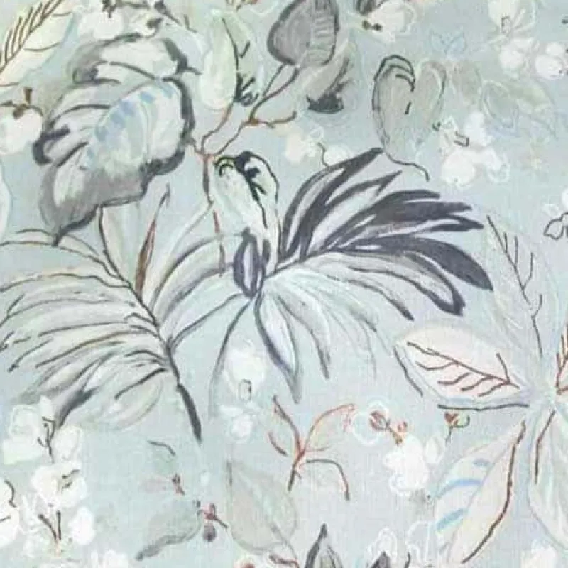 Takara Rain is a pretty neutral light blue grey fabric featuring grey watercolor tropical flowers and leaves from Regal.