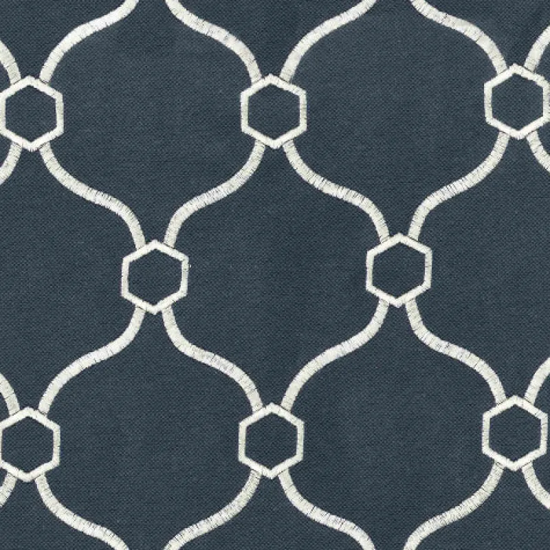 Dark Greyish Blue Silver Embroidered Geometric Quatrefoil Vera Indigo Regal Fabric