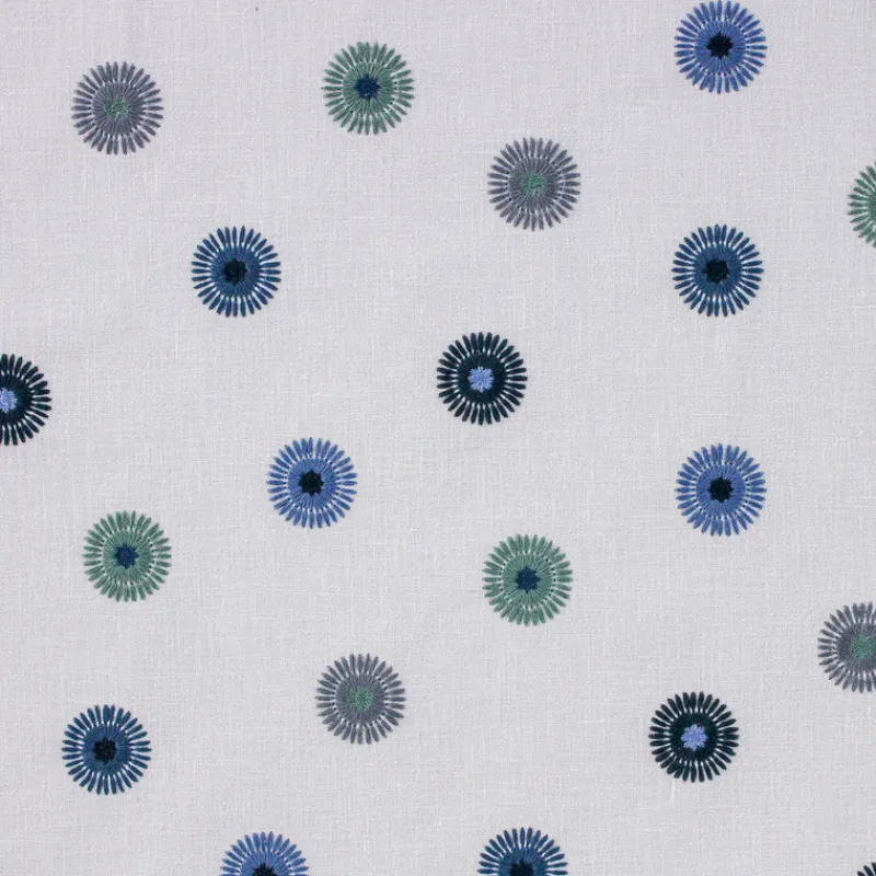 Get ready to turn any room into a vibrant Kusama Ocean with this Richloom fabric! With its contemporary geometric embroidered sunbursts in bold shades of blue, this fabric will add a playful and quirky touch to any space