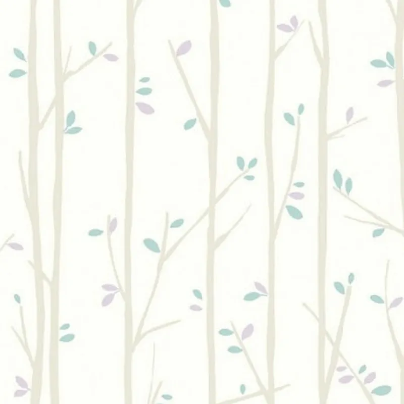 Tiny light blue and purple leaves scatter between tall trees in this cute simple wallpaper.