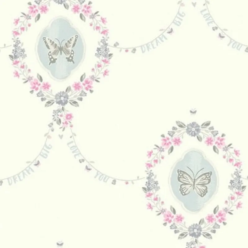 Light pink and purple flowers and butterflies scroll across this cute scripty wallpaper.