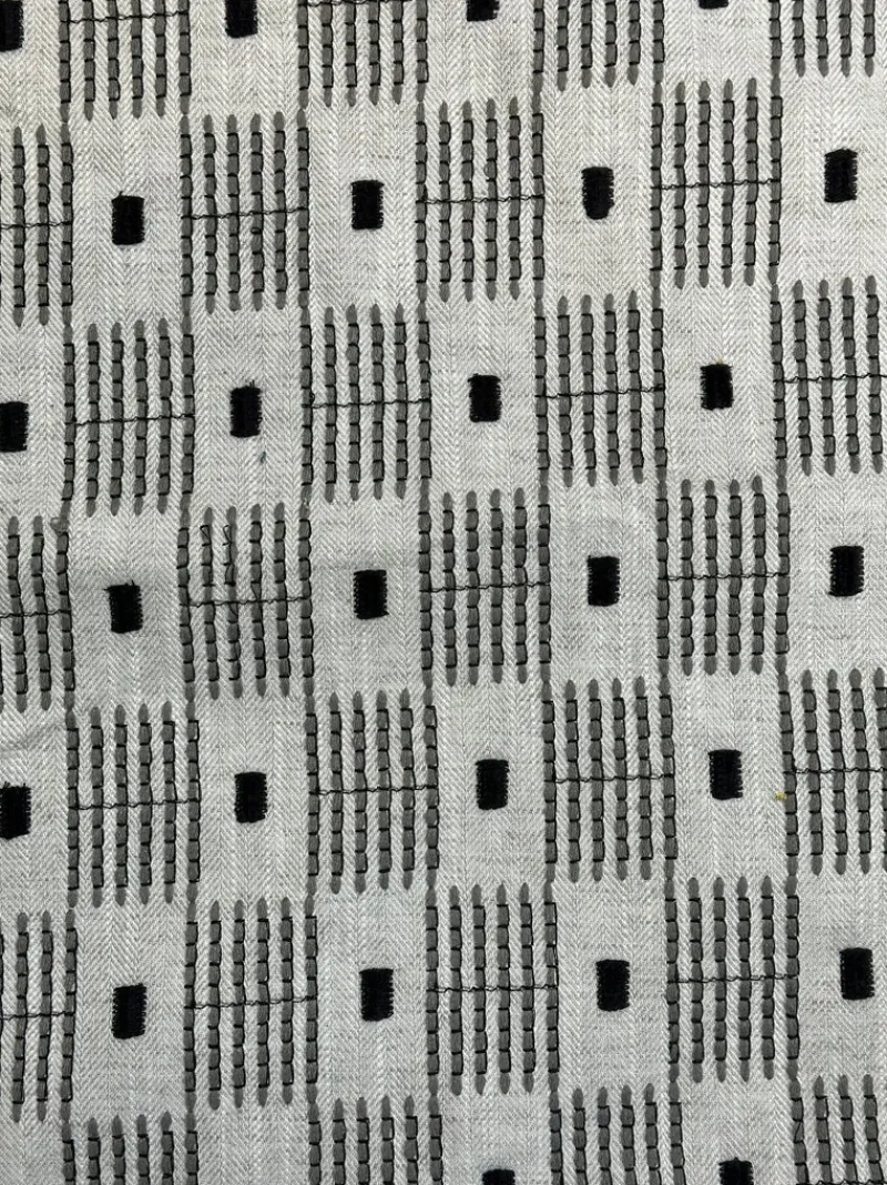 Add some character to your space with Shortcut Smoke Swavelle Mill Creek. This unique fabric features an embroidered geometric design that adds texture and interest. Elevate any project with this quirky and playful touch!