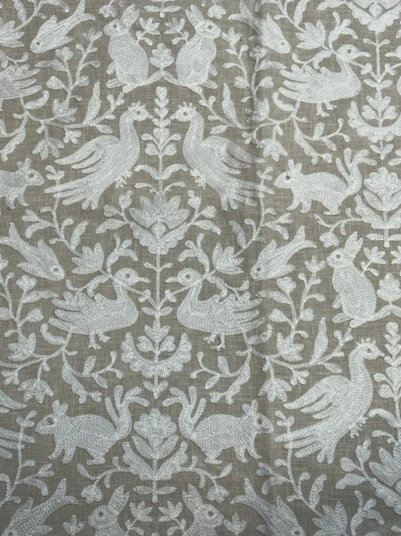 Embrace your wild side with our Woodland Whimsy Natural fabric! Featuring crewel embroidery of playful animals, this fabric adds a touch of charm to any project. Its ivory color gives off a happy and whimsical vibe, perfect for adding a bit of fun to your home decor or fashion pieces.
