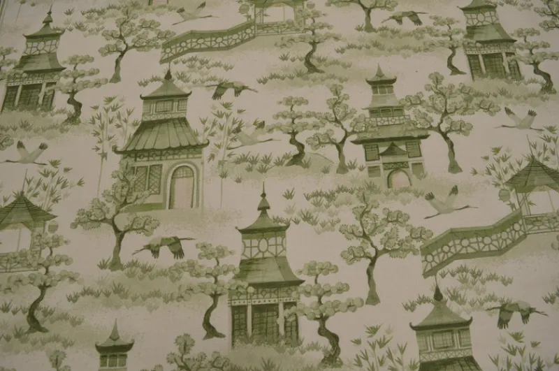 Elevate your space with Kinjo 206 Greenery Covington Fabric. This fabric features a dynamic Asian toile design with a vibrant green pagoda pattern, adding a touch of adventure and boldness to any room. Get ready to take a risk and add some excitement to your decor!