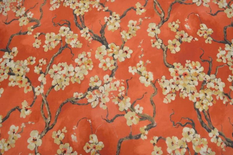 Add a pop of personality to your home decor with the Sakura 318 Persimmon Covington Fabric. This vibrant fabric features a coral orange Asian floral branch design, perfect for creating a unique and playful look. Elevate your space with this one-of-a-kind fabric!