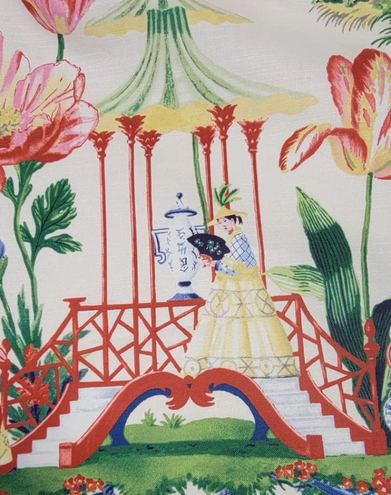 East Of The Moon Night is a white background with a bright multicolored Asian toile print. This fabric has been treated with Teflon Shield+, this is a fabric protection that allows for stain resistance and increased durability. This feature will extend the life span of your fabric and helps eliminate excess waste. There is no better way to give your home a new look while helping protect our environment!