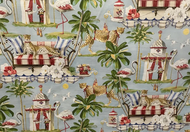 Night In India Dawn is a truly one of a kind print patten. This topical pattern has whimsical cheetahs and flamingos. If you are wanting a colorful print for a statement piece than this pattern is a perfect fit.