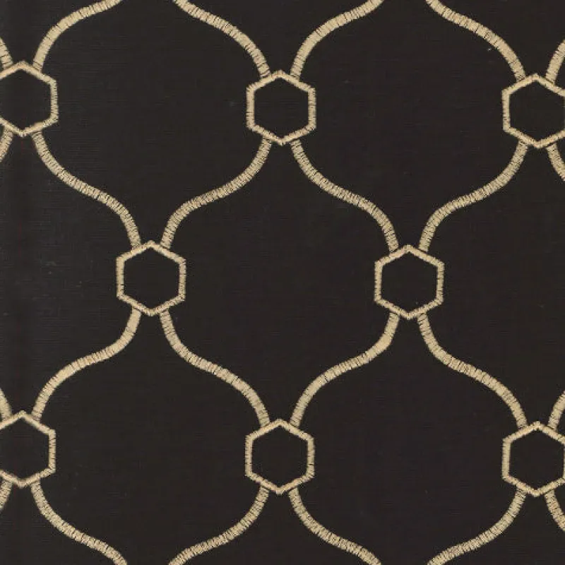 Elevate your home decor with the Vera Ebony Regal Fabric. This exquisite fabric boasts a sleek black and gold embroidered geometric quatrefoil design, adding a touch of sophistication and elegance. Perfect for adding a luxurious and unique touch to any room.