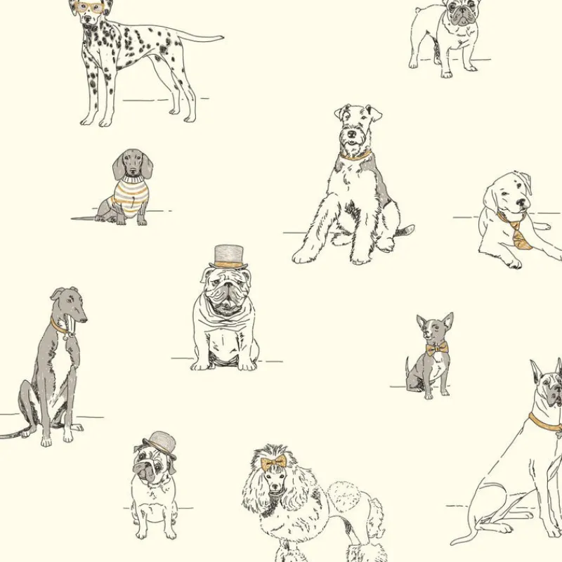 Dogs wear neutral tan and grey hats, bow ties, and collars in this fun modern black and white dog’s life wallpaper for walls that might leave you wanting a trip to the pet store.
