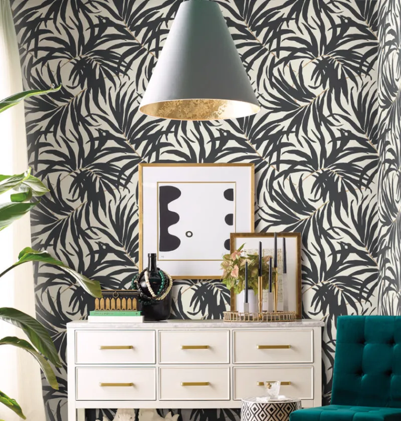 The swaying leaves of palm trees create a silhouette of smart, modern sophistication in pattern Bali Leaves.