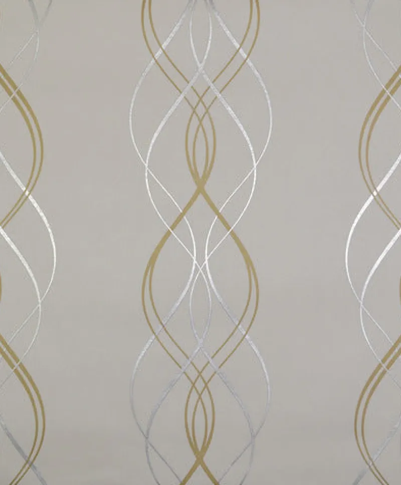 Designed with slender streamers of color and shimmering metal, Antonina Vella Aurora Wallpaper features curl-like lines winding their way from ceiling to floor in a vertical dance.