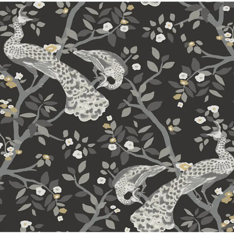 Art Nouveau inspired fanciful peacocks rest on flowering branches in pattern Plume.