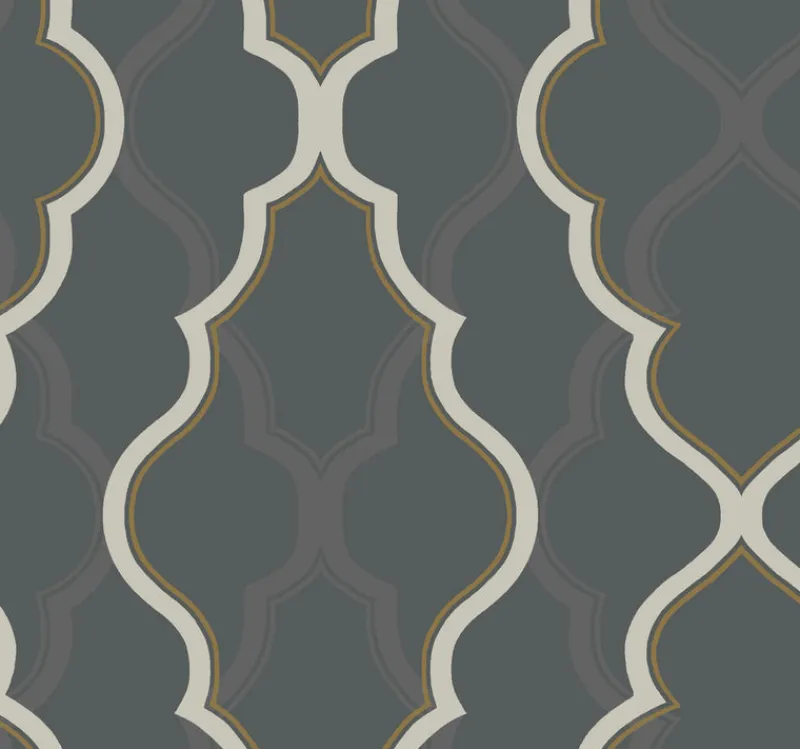 Large scale and bold with arabesque designs and metallic tracery in the foreground; soft shadows repeat the design in the background. This is Double Diamond, a strikingcontemporary wallpaper.