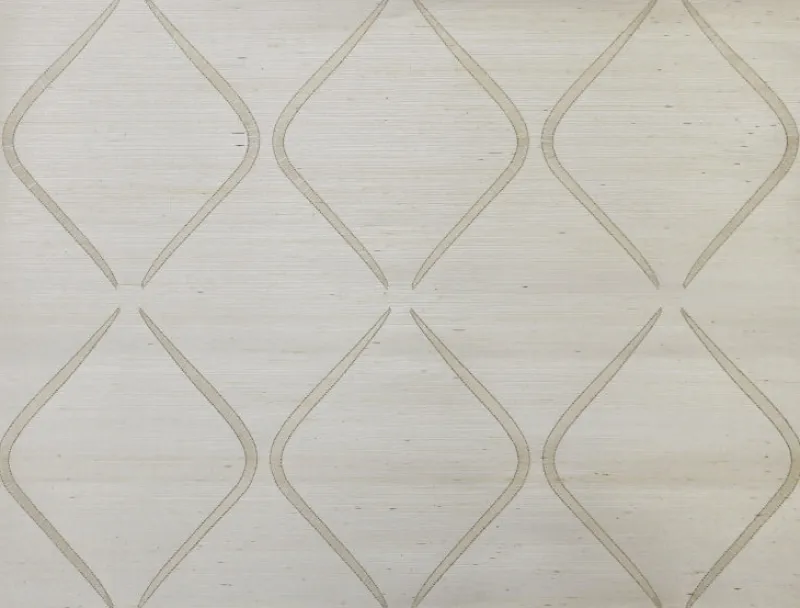 Embroidered shimmery cream colored geometric shapes create cool wavy diamonds on a neutral cream grasscloth wallpaper.