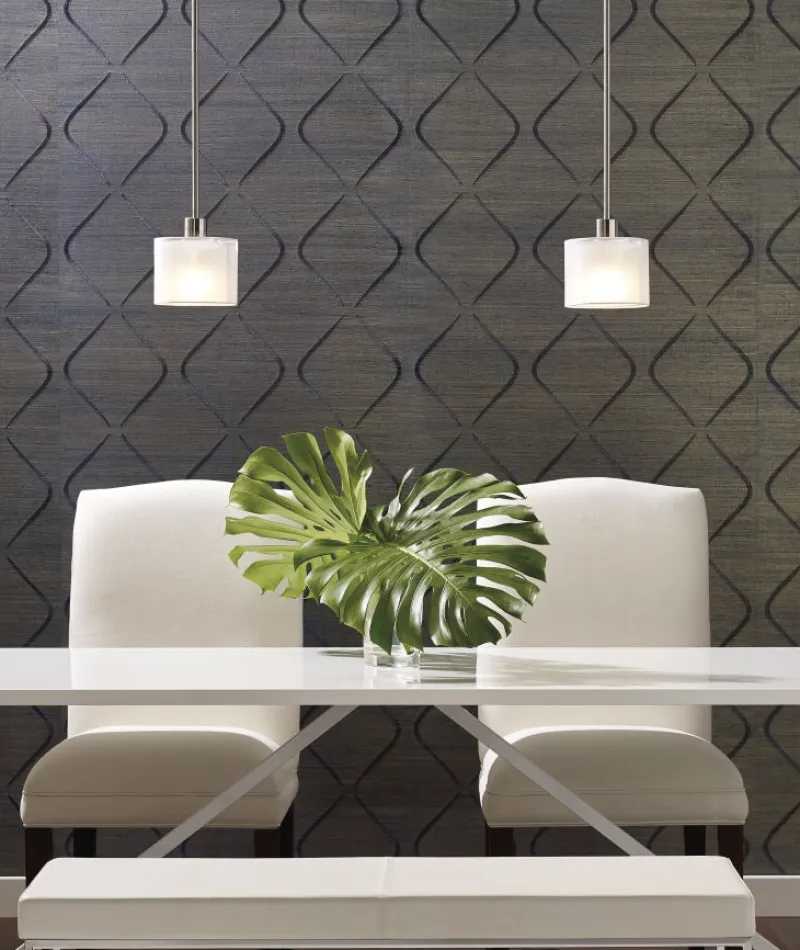 Embroidered geometric shapes create cool wavy diamonds on a neutral navy and gold shimmering grasscloth wallpaper.