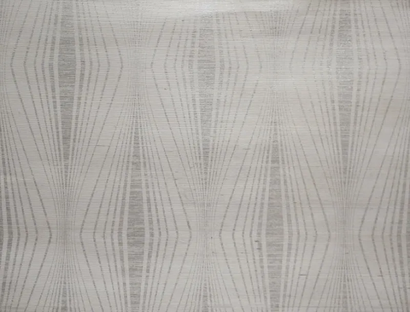 Silvery metallic grey geometric stripes create contemporary starburst diamonds in this pretty and simple cream colored textured grasscloth wallpaper.