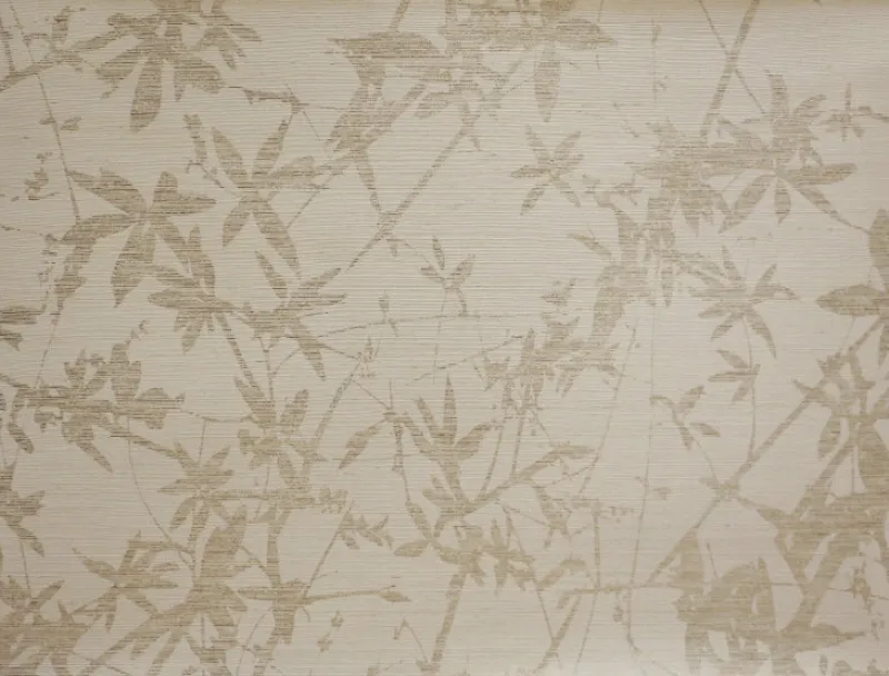 Metallic gold tropical palm trees and leaves cover this neutral cream textured grasscloth wallpaper.
