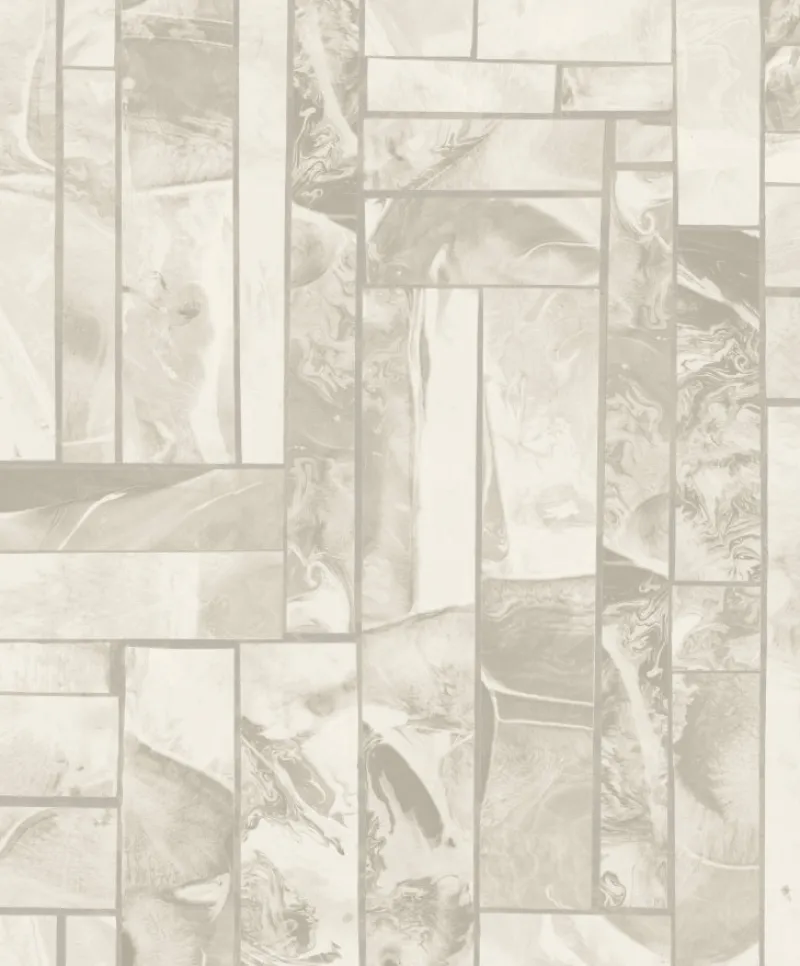 Faux marble swirls in tiles in this neutral light grey wallpaper with a little bit of shimmering silvery metallics.
