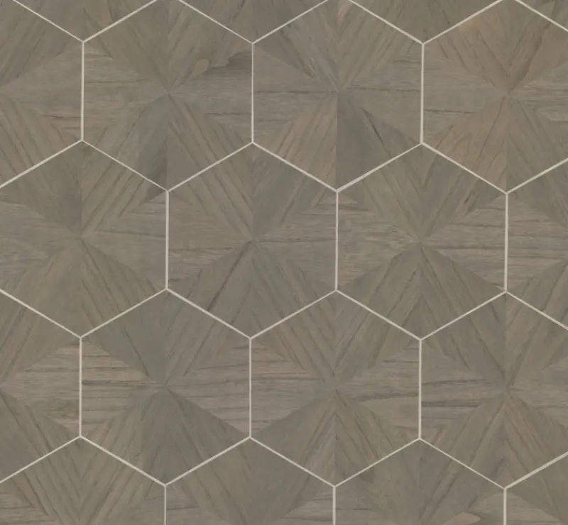 Real wood pattern Hexagram Wood Veneer is a hand inlaid six-sided geometric on metallic ground.