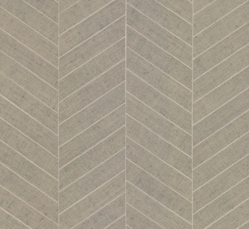A classic herringbone pattern is achieved in pattern Atelier Herringbone with hand placed woven raffia grass strips on a metallic ground.