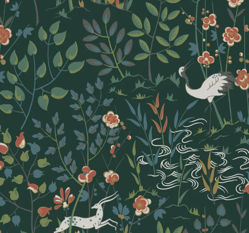 Pattern Aspen is a woodland and stag scenic pattern with Art Deco leanings.