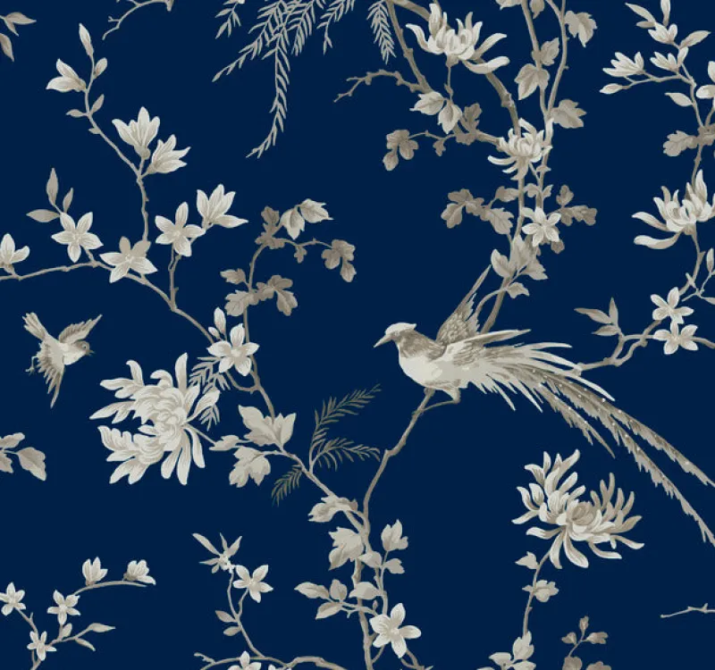 The lush foliage and songbirds of Bird and Blossom Chinoiserie create a surround of Asian inspired motifs against a luxurious metallic finish.