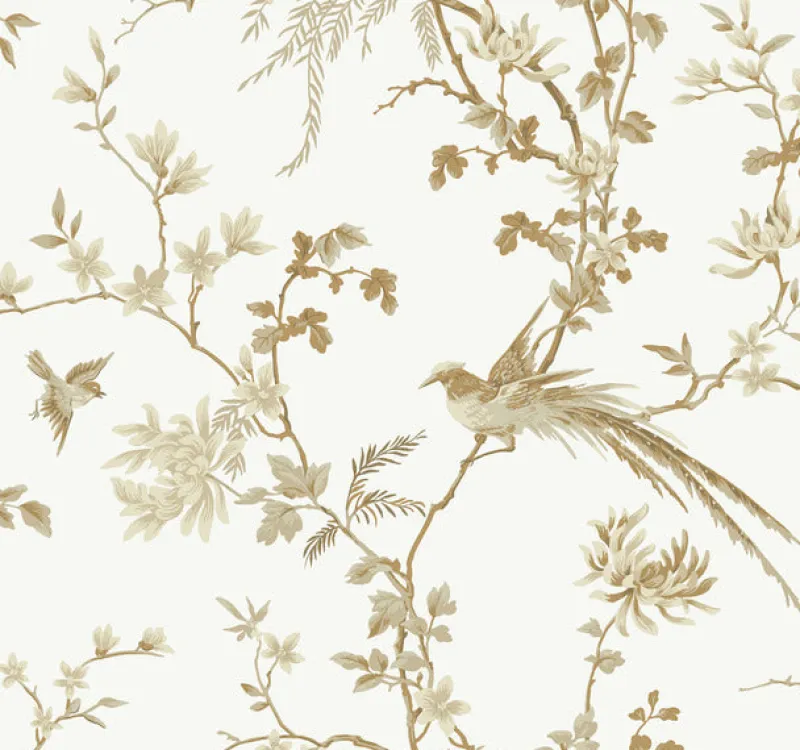 The lush foliage and songbirds of Bird and Blossom Chinoiserie create a surround of Asian inspired motifs against a luxurious metallic finish.
