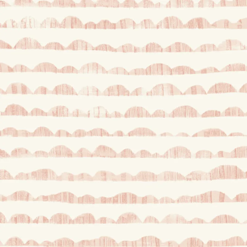 Rolling hills in silhouette create a scenic landscape of horizontal stripes with their shapes charmingly enhanced by an overlay of print, reminiscent of hand painted cloth.