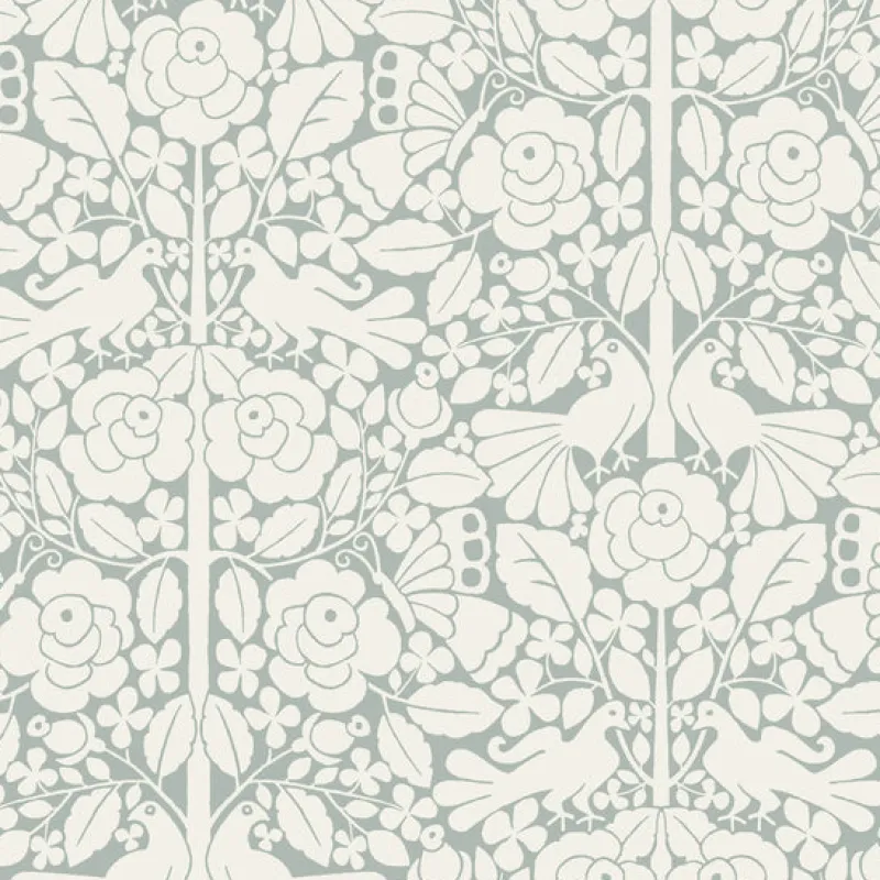 This whimsical pattern depicts an allover white painterly silhouette that is inspired by European folk art prints.