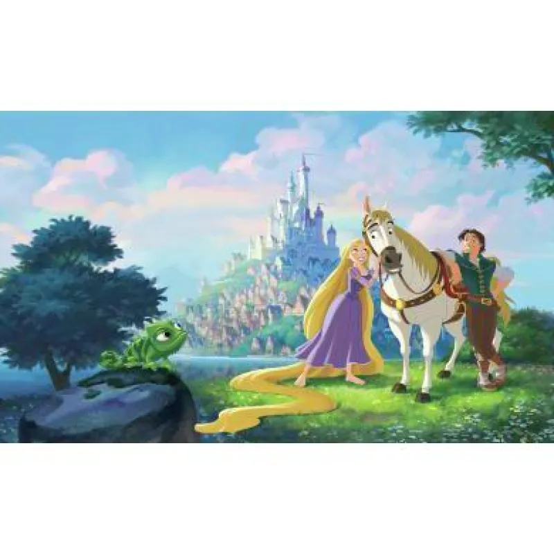 Rapunzel and the prince stand in front of a castle in this big wall mural that brings you into the story, alongside Pascal the chameleon.