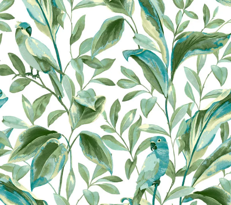 Pretty parrots rest upon lush, tropic leaves in the colorful watercolor rendering of pattern Tropical Lovebirds.